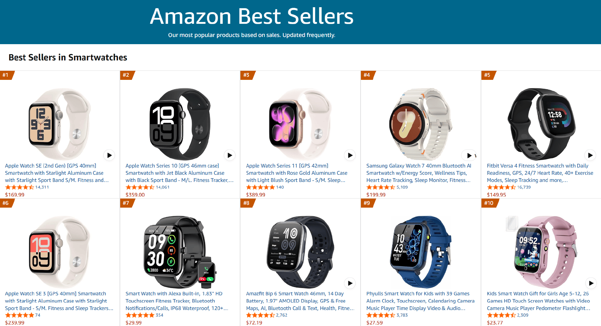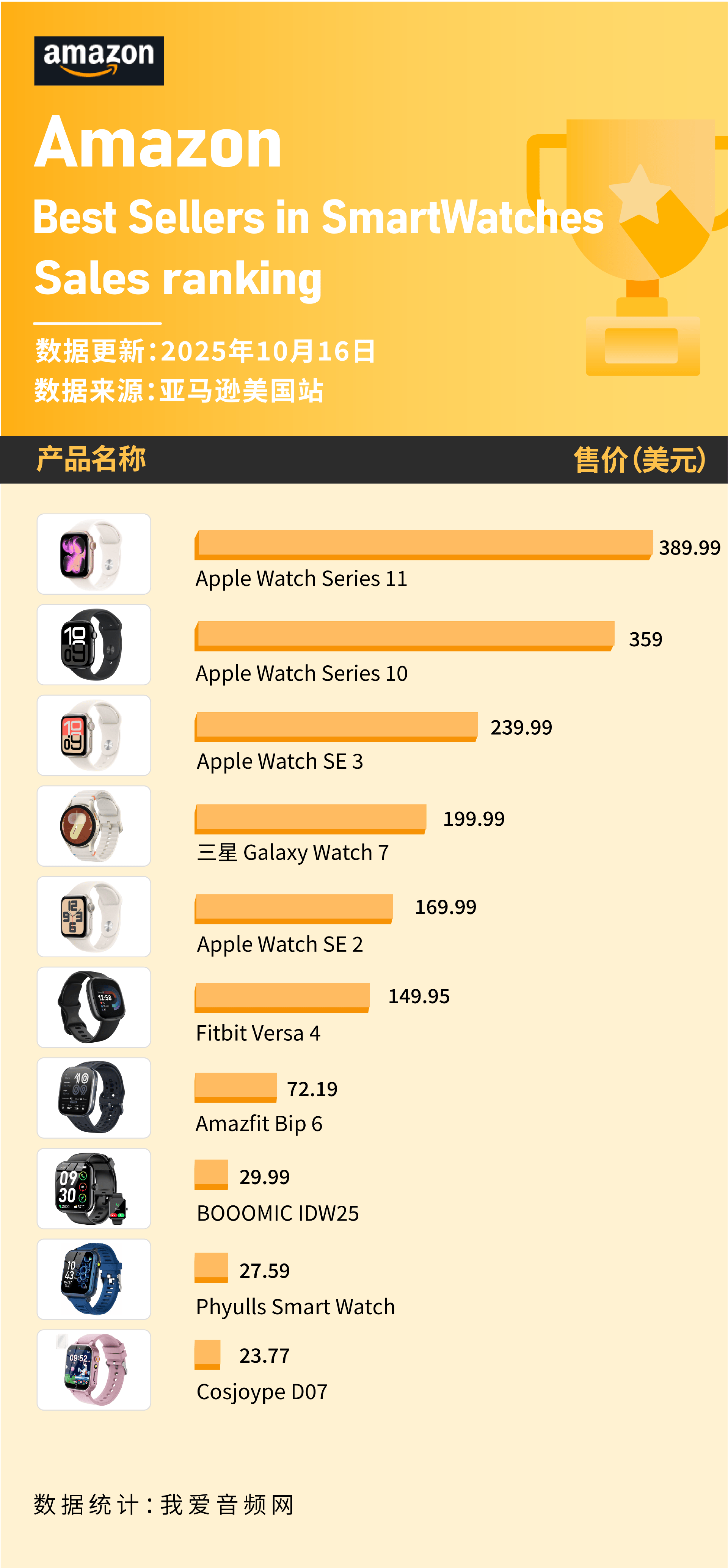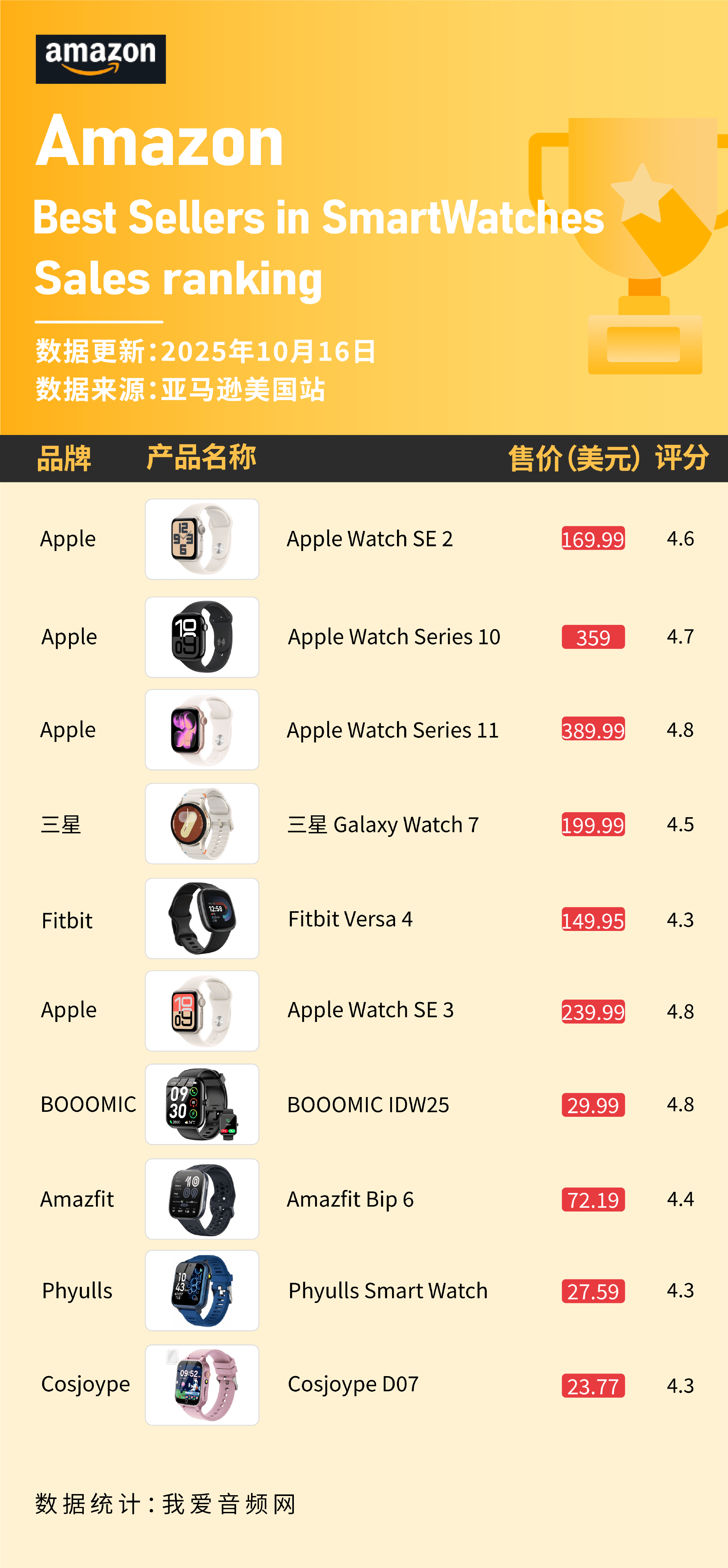 榜单中剩下的4款产批评分均低于4.5分,2025年10月的美国亚马逊智妙手表发卖榜中?