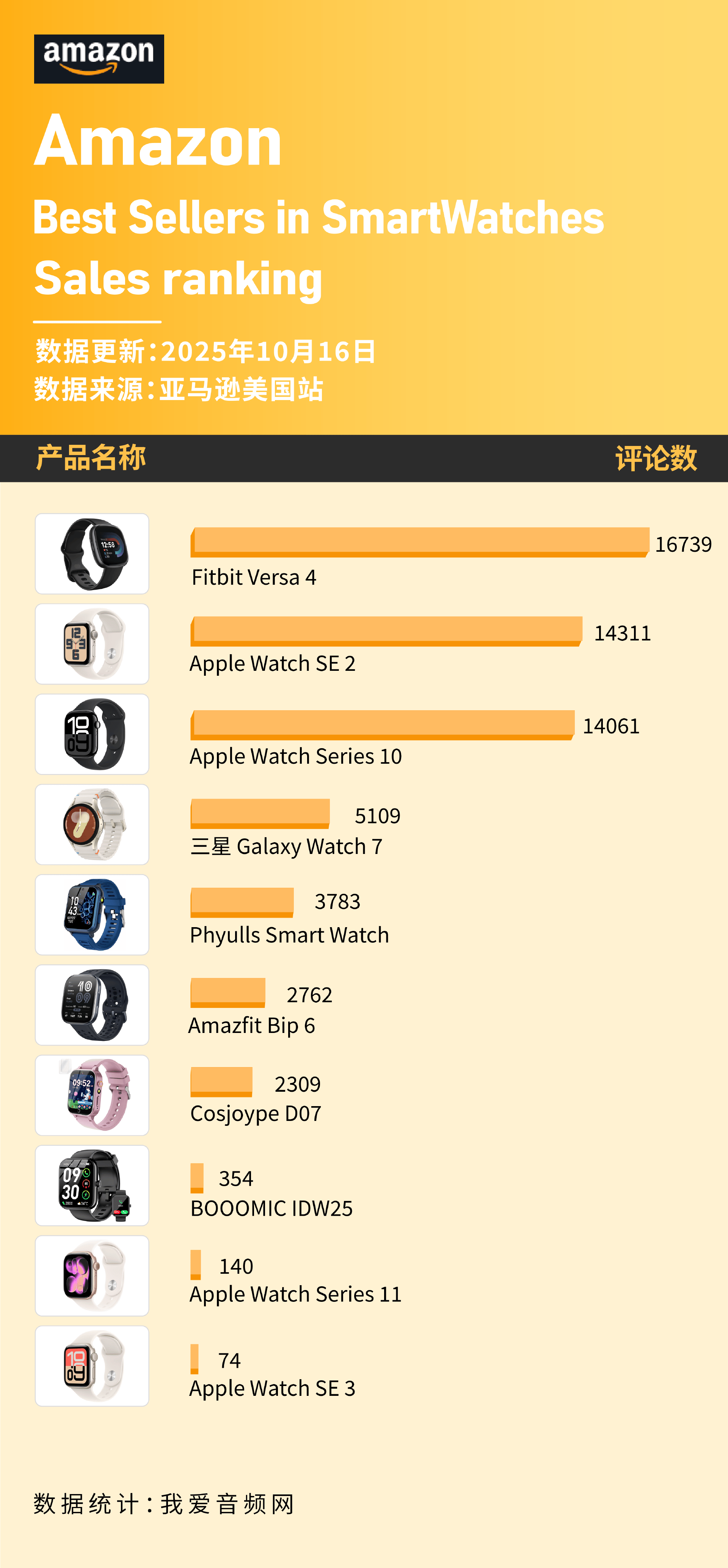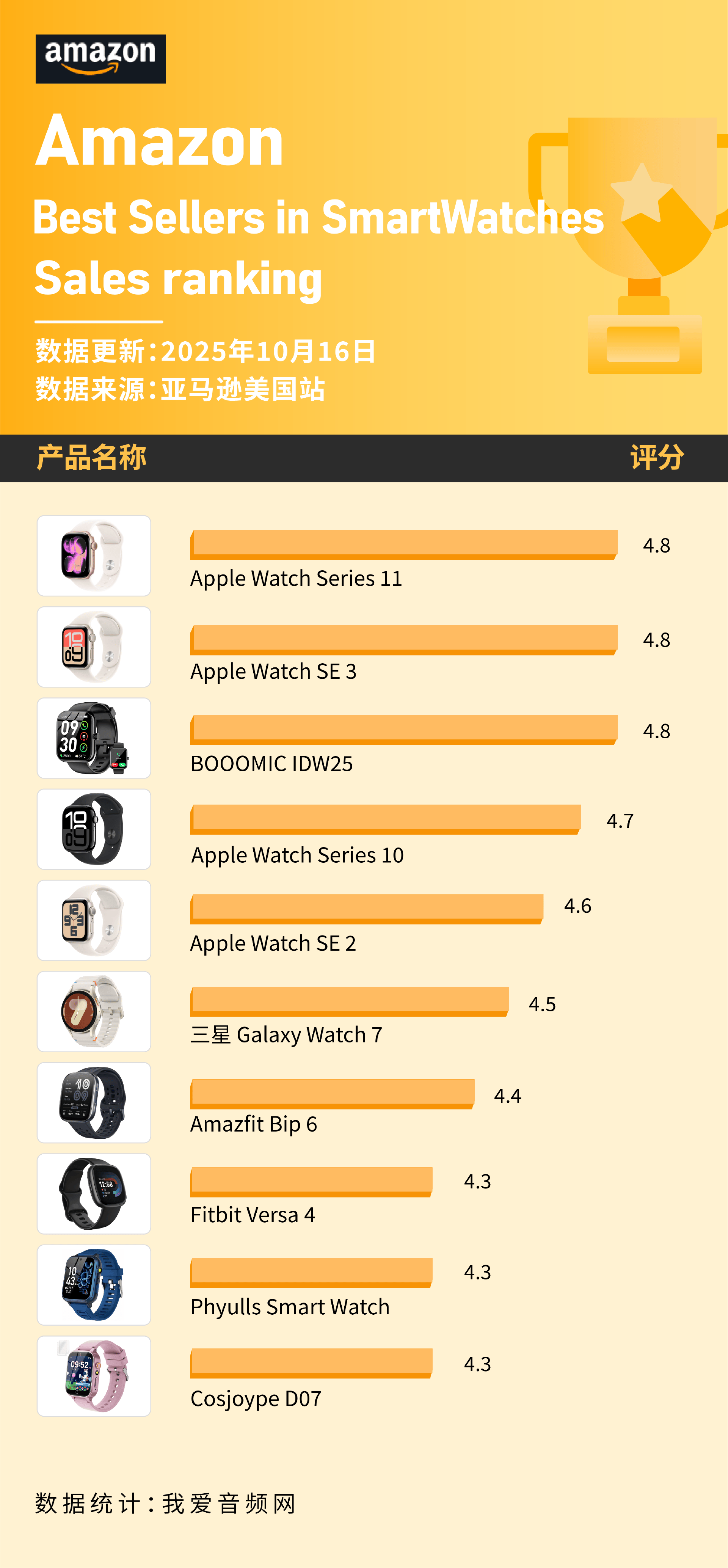 榜单中剩下的4款产批评分均低于4.5分,2025年10月的美国亚马逊智妙手表发卖榜中?